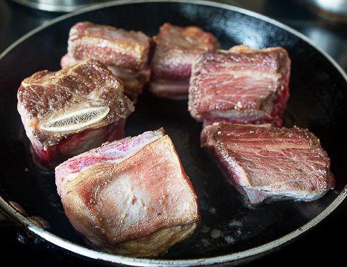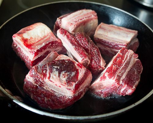 Heat a couple spoonfuls of vegetable oil in a pan over high heat. Quickly sear the ribs on all sides until browned – literally for a couple of minutes.