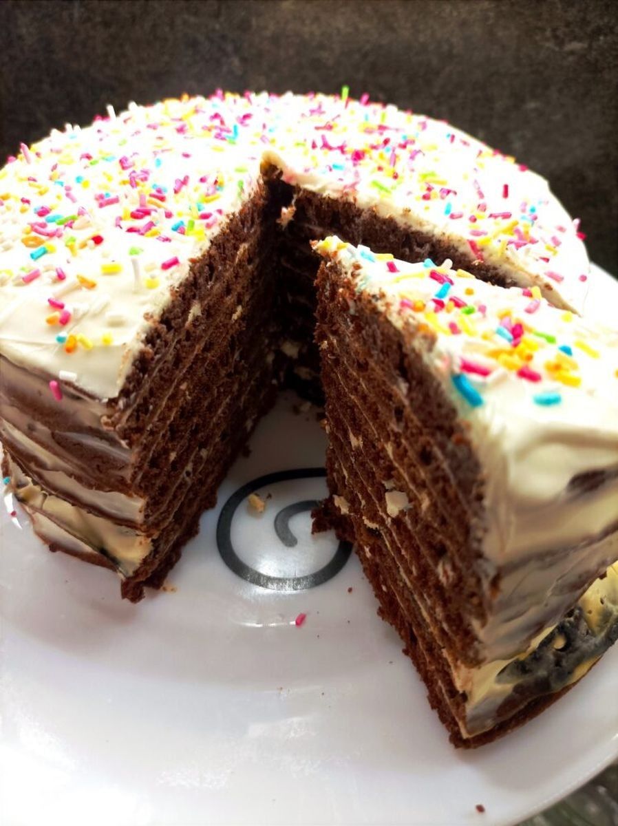 Chocolate pancakes make a fantastic chocolate cake! The cream is sour cream and sugar, and the topping is colorful. It’s easy and very delicious