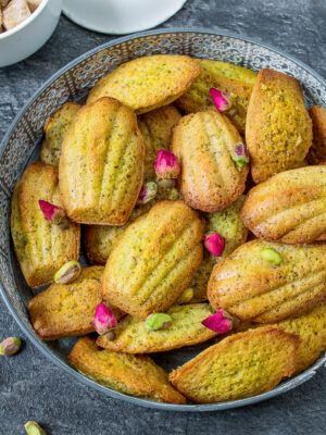 - Nuts. Pistachios give these madeleines their signature flavor, aroma, and, of course, their color. The vibrancy of the tint depends on the nuts themselves. Keep in mind that roasted pistachios tend to lean toward yellow tones but offer a more intense flavor, while raw pistachios provide a brighter, greener hue.