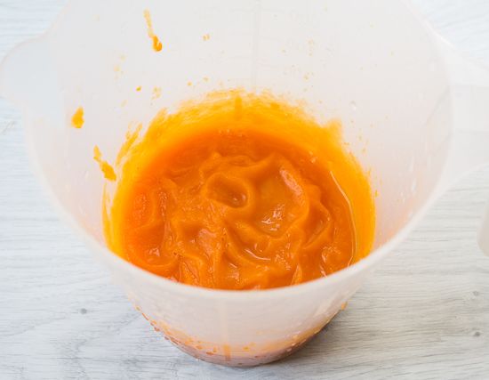 Peel and dice the pumpkin. Boil it until it is fully cooked, then drain off all the liquid. Puree the flesh until smooth. If the purée is watery, transfer it to a saucepan. Cook it over medium heat, stirring constantly, to evaporate the excess moisture.