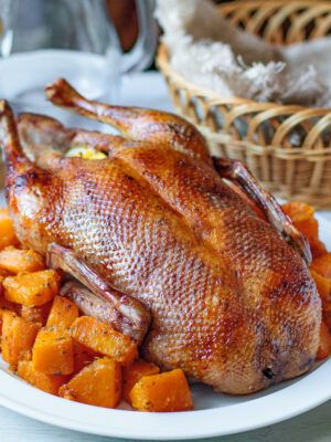 - Duck. This recipe is designed for a large duck, approximately 2.2–2.5 kg (4.8–5.5 lbs). When portioned correctly, this is enough for 6 servings. A smaller bird will roast faster, while a larger one will require more time. For perfect results every time, I recommend using a meat thermometer. Insert it into the thickest part of the duck—ideally the thigh—avoiding the bone. Once it reaches an internal temperature of 68–70°C (155–158°F), remove the duck from the oven. Let it rest; the carryover heat will bring the final temperature to a safe and succulent 73–75°C (165°F).